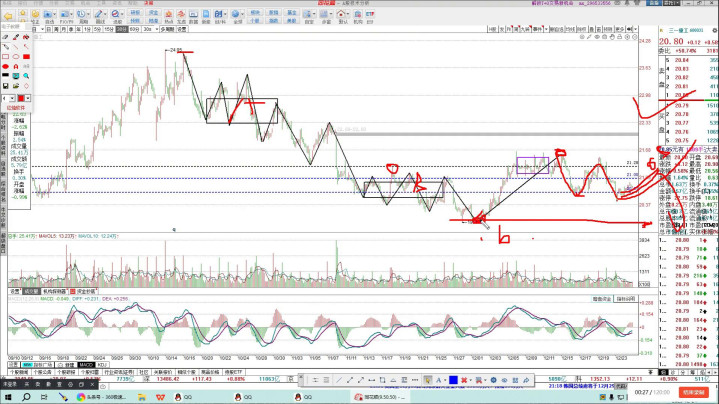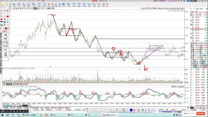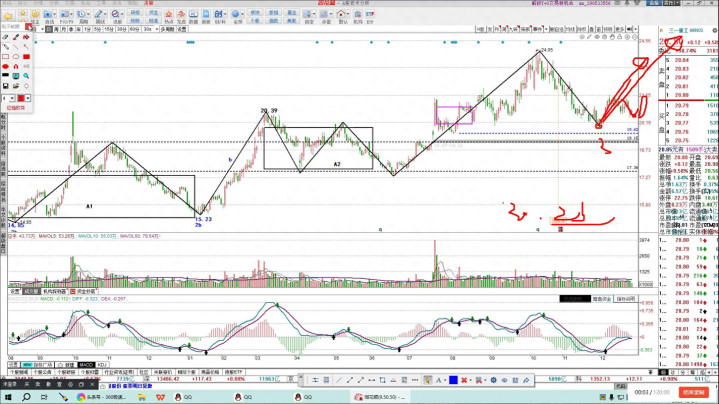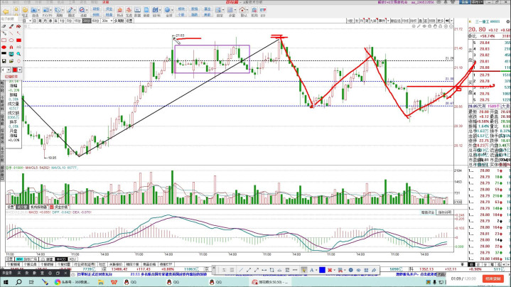 所以三一重工在目前结构上来说,我认为它的调整时间理论上已经差不多了。在三十分钟结构上面,现在向下还没有底分型,底分型需要占上最高点,也就占上二十一。目前来看没有占上二十一,但是前面这个低点给大家找的位置确实有支撑,看一下能否很快拉起来。如果能够拉起来,三一重工就脱离了危险。